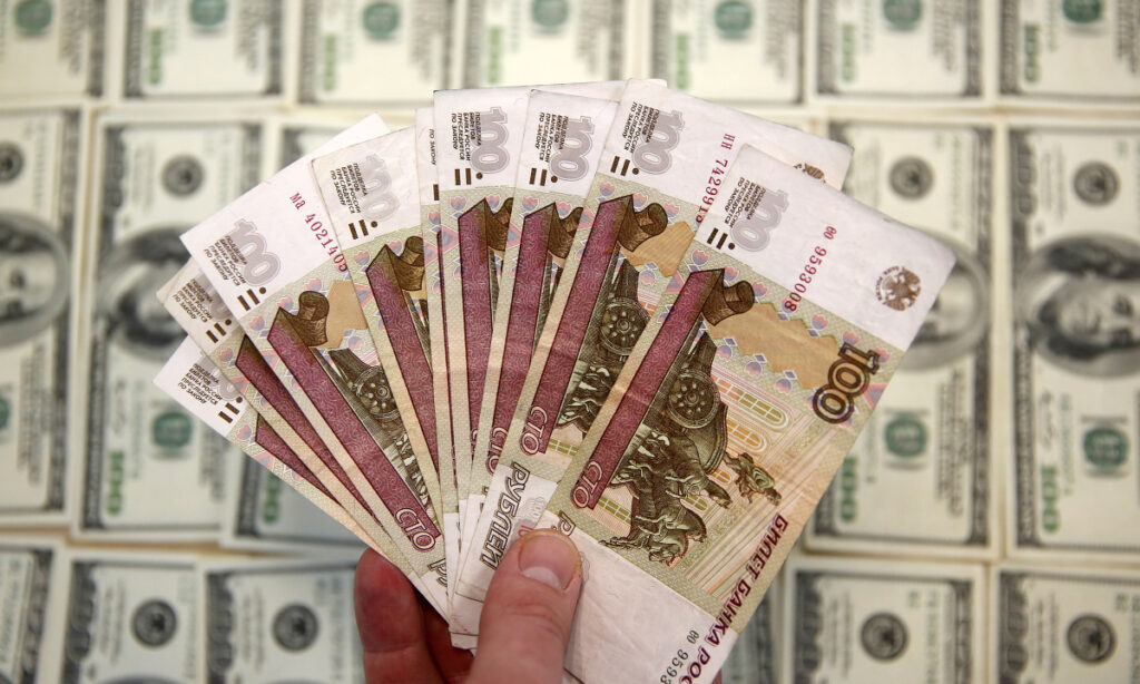 Tiền ruble được chụp trên nền USD. Ảnh: Reuters