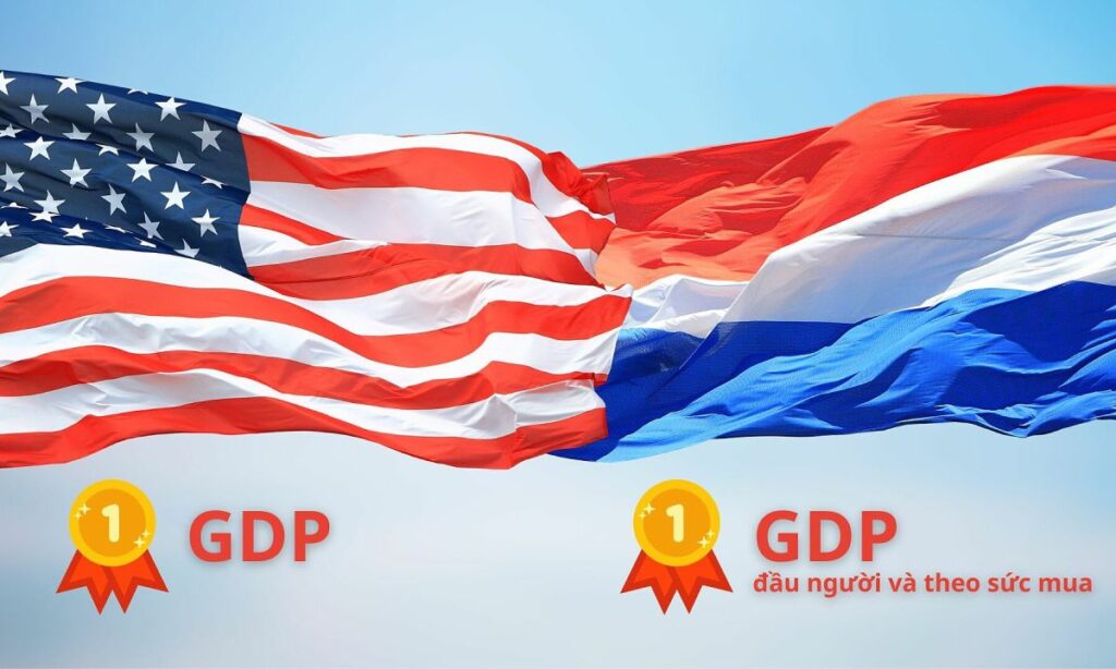 Quốc kỳ Mỹ (trái) và Luxembourg (phải), hai nền kinh tế dẫn đầu về độ giàu tính theo GDP hoặc GDP đầu người và thu nhập đầu người theo sức mua tương đương. Đồ họa: Phiên An