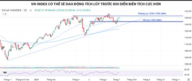 Nhìn chung, bối cảnh vĩ mô trong và ngoài nước đang có sự cải thiện. Tỷ giá ổn định trở lại khi các dữ liệu kinh tế Mỹ ủng hộ Fed giảm lãi suất, dự kiến vào tháng 9 tới. Kinh tế trong nước đang đi qua những khó khăn, hoạt động sản xuất – kinh doanh và tiêu dùng trở nên vững chãi hơn, qua đó tác động tích cực đến thị trường chứng khoán. Tâm lý thị trường được cải thiện và độ rộng của sắc xanh tăng dần qua từng phiên cho thấy, VN-Index đang nỗ lực kết thúc nhịp điều chỉnh kỹ thuật. Thời điểm hiện tại có thể nhận định, chỉ số sẽ dao động tích lũy trong vùng 1.250 – 1.290 điểm trước khi diễn biến trở nên tích cực hơn.