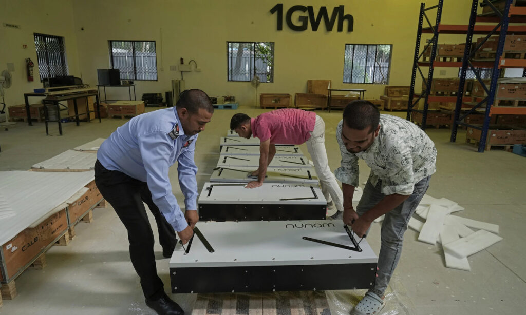 Các bộ trữ điện tái chế từ pin xe điện cũ của Nunam. Ảnh: AP