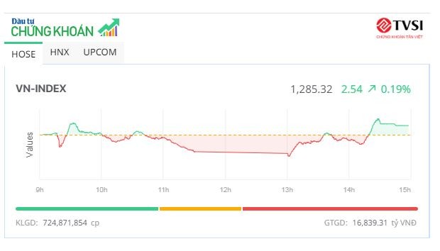 Đóng cửa, sàn HOSE có 172 mã tăng và 212 mã giảm, VN-Index tăng 2,54 điểm (+0,2%) lên 1.285,32 điểm. Tổng khối lượng giao dịch đạt gần 724,9 triệu đơn vị, giá trị 16.839,3 tỷ đồng, tăng 5,5% về khối lượng và 7,9% về giá trị so với phiên hôm qua. Giao dịch thỏa thuận đóng góp 89,17 triệu đơn vị, giá trị 2.583,25 tỷ đồng.