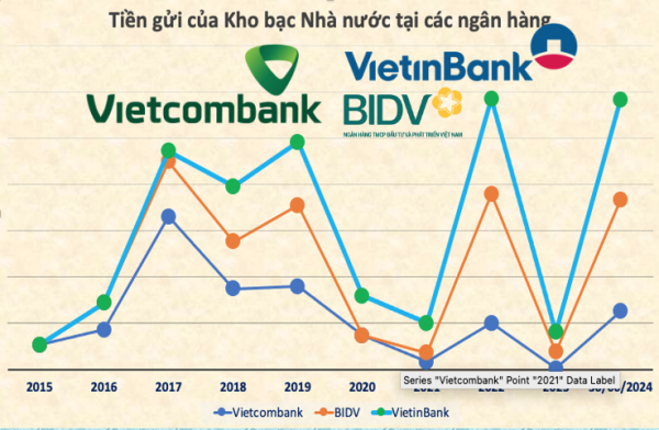 Điểm nổi bật trong báo cáo tài chính nửa đầu năm 2024, ngoài nợ xấu tăng mạnh, còn là sự gia tăng đột biến của số tiền gửi Kho bạc Nhà nước tại các ngân hàng thương mại Nhà nước như Vietcombank (VCB), VietinBank (CTG) và BIDV (BID).