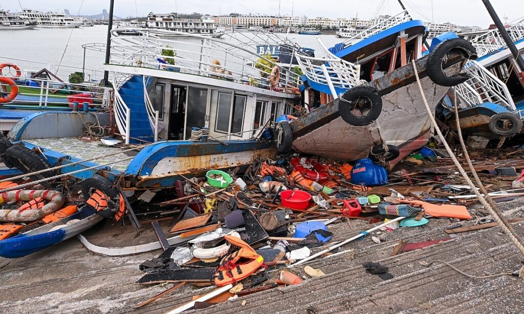 Tàu du lịch bị bão Yagi đánh chìm tại Cảng quốc tế Tuần Châu, TP Hạ Long, Quảng Ninh, ngày 8/9. Ảnh: Giang Huy