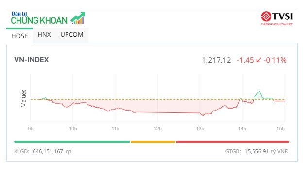 Chốt phiên, sàn HOSE có 184 mã tăng và 181 mã giảm, VN-Index giảm 1,45 điểm (-0,12%) xuống 1.217,12 điểm. Tổng khối lượng giao dịch đạt hơn 646 triệu đơn vị, giá trị 15.556 tỷ đồng, giảm 13,92% về khối lượng và 16,6% về giá trị so với phiên hôm qua. Giao dịch thỏa thuận đóng góp gần 90,2 triệu đơn vị, giá trị 2.208,5 tỷ đồng.