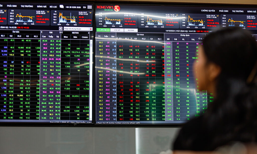 Nhà đầu tư đang quan sát bảng điện chứng khoán. Ảnh: An Khương