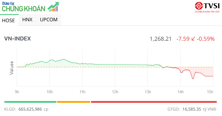 Đóng cửa, sàn HOSE có 118 mã tăng và 285 mã giảm, VN-Index giảm 7,59 điểm (-0,59%), xuống 1.268,21 điểm. Tổng khối lượng giao dịch đạt hơn 665,6 triệu đơn vị, giá trị 16.585,3 tỷ đồng, tăng nhẹ gần 3% về khối lượng và hơn 5% về giá trị so với phiên hôm qua. Giao dịch thỏa thuận đóng góp hơn 71,1 triệu đơn vị, giá trị 1.764 tỷ đồng.