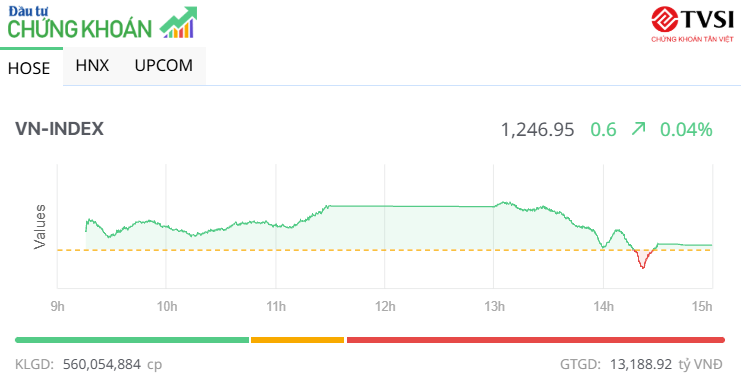 Đóng cửa, sàn HOSE có 156 mã tăng và 252 mã giảm, VN-Index tăng 0,60 điểm (+0,05%), lên 1.246,95 điểm. Tổng khối lượng giao dịch đạt hơn 560 triệu đơn vị, giá trị 13.188,9 tỷ đồng, tương đương về khối lượng và giảm nhẹ 4% về giá trị so với phiên hôm qua. Giao dịch thỏa thuận đóng góp gần 54 triệu đơn vị, giá trị 1.434 tỷ đồng.