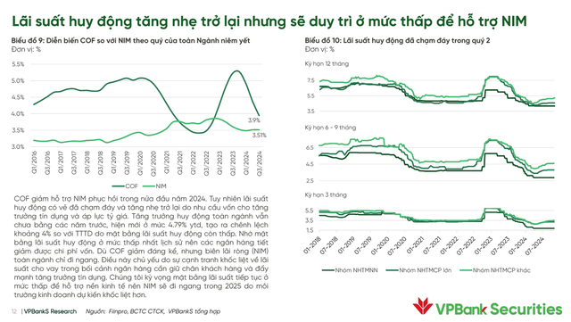 Chia sẻ tại hội thảo, ông Đào Hồng Dương, Giám đốc phân tích Ngành và Cổ phiếu – VPBankS Research đánh giá, ngành ngân hàng năm 2025 áp lực NIM giảm do xu hướng điều hành chính sách tiền tệ yêu cầu giảm lãi cho vay, áp lực cạnh tranh giữa các ngân hàng, nhu cầu tín dụng bán lẻ còn yếu và chi phí huy động đã chạm đáy. Mặt bằng lãi suất huy động 6 tháng, 9 tháng và 12 tháng đã nhích nhẹ.