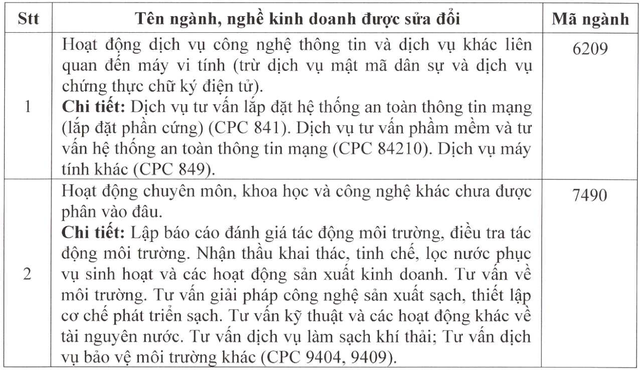 Đồng thời, Công ty cũng sửa đổi chi tiết 2 ngành, nghề kinh doanh sau: