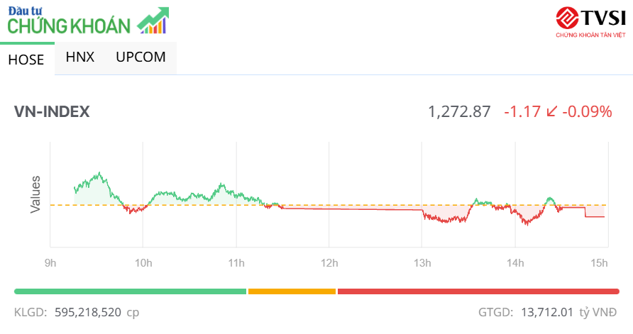 Chốt phiên, sàn HOSE có 187 mã tăng và 226 mã giảm, VN-Index giảm 1,17 điểm (-0,09%), xuống 1.272,87 điểm. Tổng khối lượng giao dịch đạt hơn 595,2 triệu đơn vị, giá trị 13.712 tỷ đồng, giảm 27% cả về khối lượng và giá trị so với phiên hôm qua. Giao dịch thỏa thuận đóng góp hơn 93,1 triệu đơn vị, giá trị 3.071 tỷ đồng.