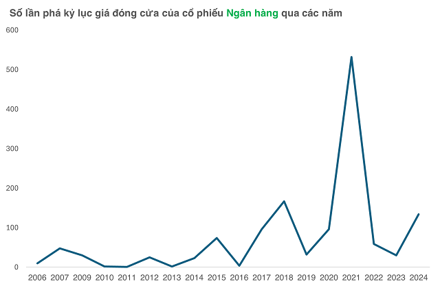 Tổng cộng, toàn bộ ngành Ngân hàng đang có 134 lần phá đỉnh trong năm 2024, kỷ lục thứ 3 trong lịch sử hoạt động. Trong đó, giai đoạn quý 1/2024 ghi nhận số lần phá đỉnh nhiều nhất với 53 lần, kế đến quý 3 (42 lần), quý 2 (30 lần) và quý 4 đang là 9 lần.