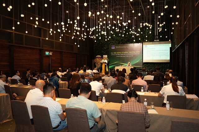 Tổng Giám đốc Vũ Tiến Dương (trái) và Chủ tịch Phùng Tuấn Hà (phải) trả lời cổ đông trong phiên thảo luận đại hội.