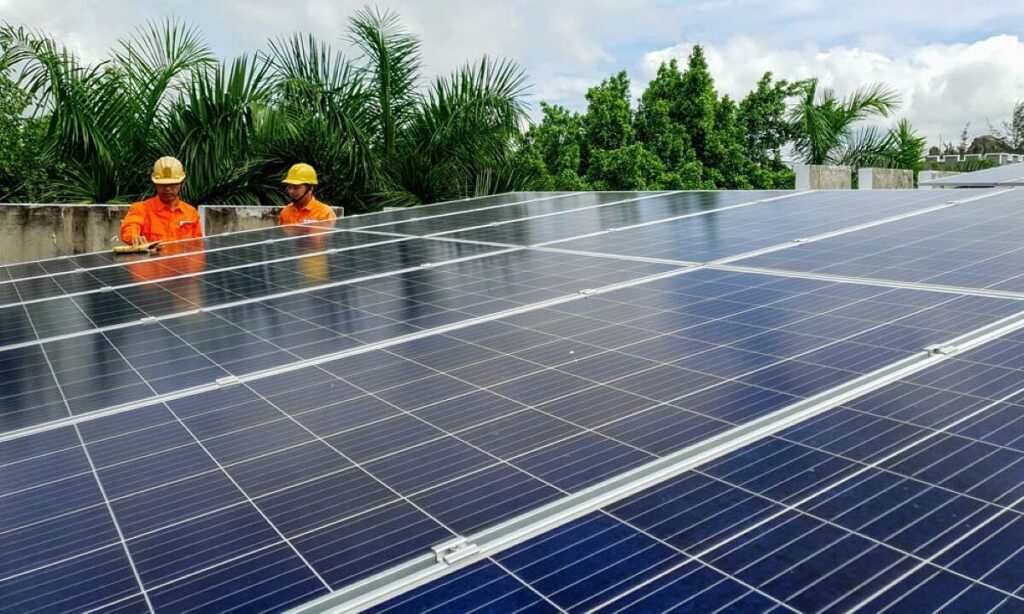 Công nhân lắp đặt tại một dự án điện mặt trời mái nhà. Ảnh: VGP