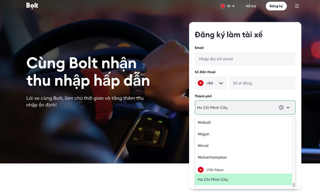 Website của Bolt đã có hỗ trợ tiếng Việt và tuyển tài xế tại TP HCM.