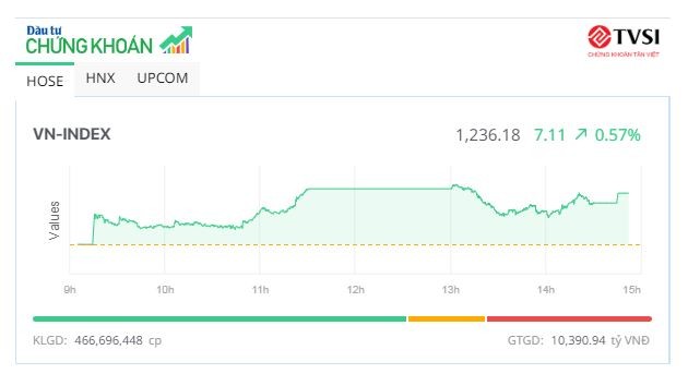 Đóng cửa, sàn HOSE có 287 mã tăng và 127 mã giảm, VN-Index tăng 7,11 điểm (+0,58%) lên 1.236,18 điểm. Tổng khối lượng giao dịch đạt 466,7 triệu đơn vị, giá trị 10.391 tỷ đồng, tăng 24,62% về khối lượng và 21,84% về giá trị so với phiên hôm qua. Giao dịch thỏa thuận đóng góp hơn 74 triệu đơn vị, giá trị 1.938,9 tỷ đồng.