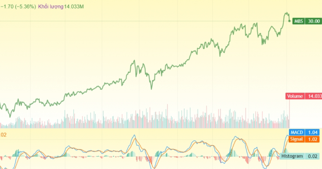 Sau một tuần đi ngang tại vùng giá đỉnh lịch sử 32.000 đồng, cổ phiếu CTCP Chứng khoán MB (Mã MBS – HNX) bất ngờ giảm mạnh 5,4%, đóng cửa tại mức 30.000 đồng/cp. Thanh khoản đến đạt kỷ lục hơn 14 triệu đơn vị – gấp 3 lần trung bình 20 phiên. Trong số này, 62,6% được bán ra chủ động.