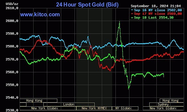 Trong phiên giao dịch 18/9, giá vàng thế giới giao ngay có thời điểm tăng tới 35 USD một ounce, lập đỉnh mới tại 2.600 USD. Giá tăng vọt ngay sau khi Cục Dự trữ liên bang Mỹ (Fed) thông báo giảm lãi suất tham chiếu thêm 50 điểm cơ bản (0,5%). Lãi suất hạ giúp công cụ không trả lãi như vàng hấp dẫn hơn.
