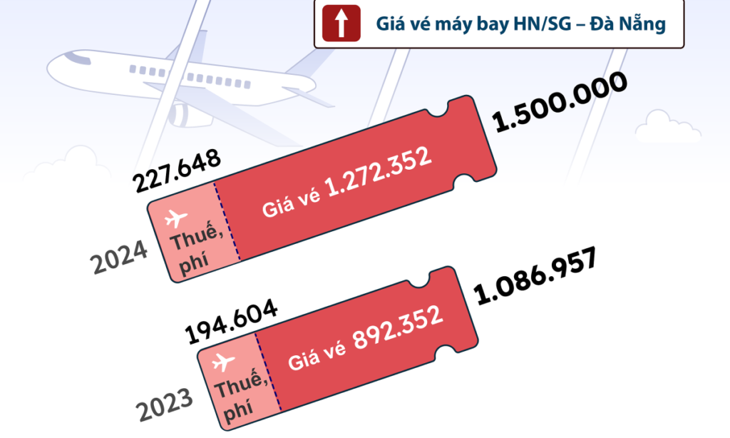 Trên các đường bay Hà Nội/TP HCM đi và đến Đà Nẵng, giá vé trung bình mỗi chiều của Vietnam Airlines khoảng 1,8 triệu đồng (tăng 17-26%), Vietjet 1,3 – 1,5 triệu (tăng 32-38%), Bamboo Airways từ 1,3-1,6 triệu (tăng 13-29%), Vietravel Airlines 1,1-1,4 triệu (tăng 13-29%).