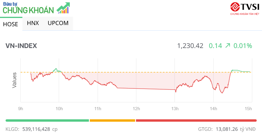 Chốt phiên, sàn HOSE có 162 mã tăng và 234 mã giảm, VN-Index tăng 0,14 điểm (+0,01%), lên 1.230,42 điểm. Tổng khối lượng giao dịch đạt hơn 539,1 triệu đơn vị, giá trị 13.081,3 tỷ đồng, giảm nhẹ 2% về khối lượng và 6% về giá trị so với phiên hôm qua. Giao dịch thỏa thuận đóng góp hơn 50,7 triệu đơn vị, giá trị 1.425,6 tỷ đồng.