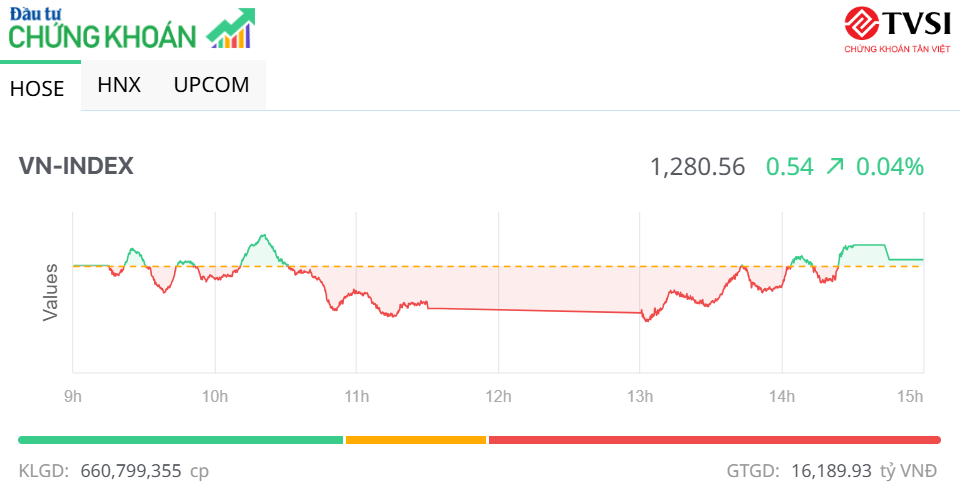 Đóng cửa, sàn HOSE có 169 mã tăng và 235 mã giảm, VN-Index tăng 0,54 điểm (+0,04%), lên 1.280,56 điểm. Tổng khối lượng giao dịch đạt hơn 660,3 triệu đơn vị, giá trị 16.183,1 tỷ đồng, giảm 15% về khối lượng và 12% về giá trị so với phiên hôm qua. Giao dịch thỏa thuận đóng góp hơn 70,8 triệu đơn vị, giá trị 1.763 tỷ đồng.