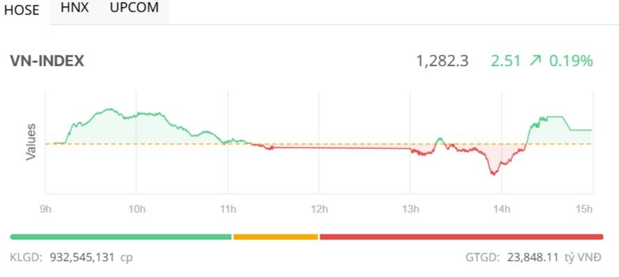 Đóng cửa, sàn HOSE có 189 mã tăng và 242 mã giảm, VN-Index tăng 2,51 điểm (+0,20%), lên 1.282,3 điểm. Tổng khối lượng giao dịch đạt hơn 932,5 triệu đơn vị, giá trị 23.848,1 tỷ đồng, giảm 7% về khối lượng và 8% về giá trị so với phiên hôm qua. Giao dịch thỏa thuận đóng góp hơn 111,4 triệu đơn vị, giá trị 2.490 tỷ đồng.
