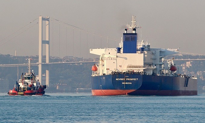 Tàu chở dầu thuộc Sovcomflot (Nga) đi qua eo biển Bosphorus (Thổ Nhĩ Kỳ) tháng 9/2020. Ảnh: Reuters