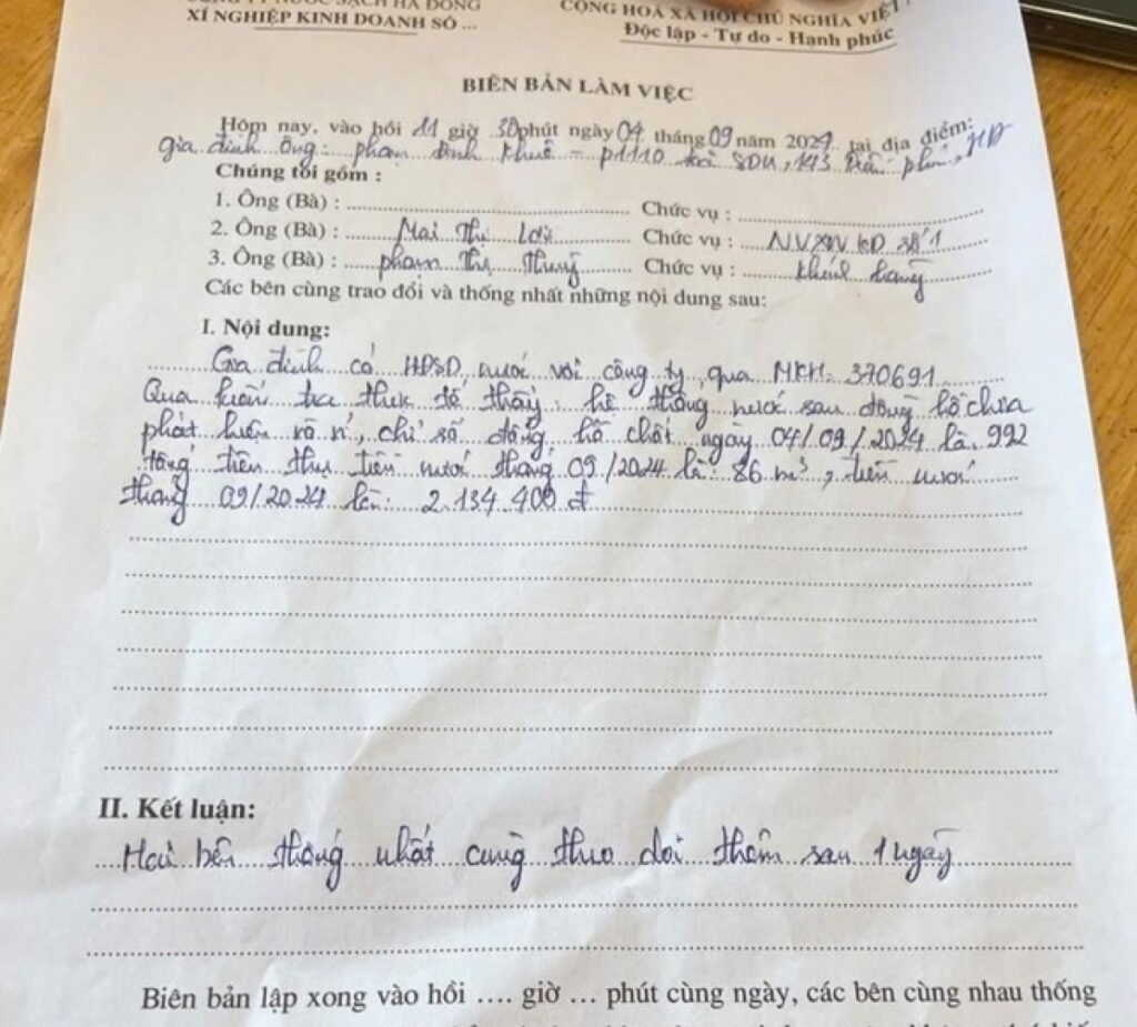| Biên bản làm việc của gia đình anh Ba cùng Công ty nước sạch Hà Đông |