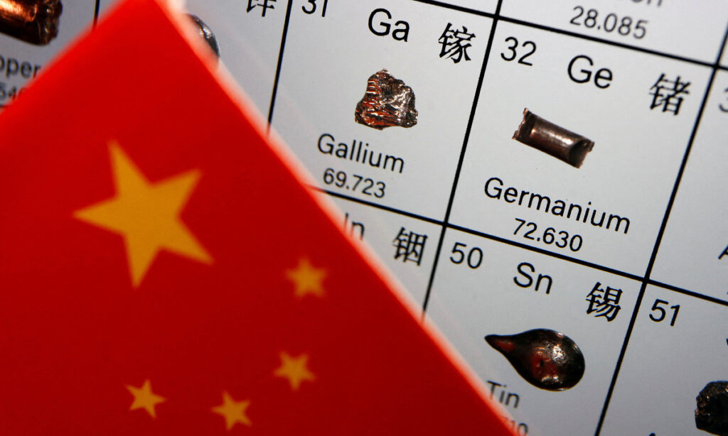 Cờ Trung Quốc cạnh các nguyên tố gallium và germanium trên bảng tuần hoàn. Ảnh:Reuters