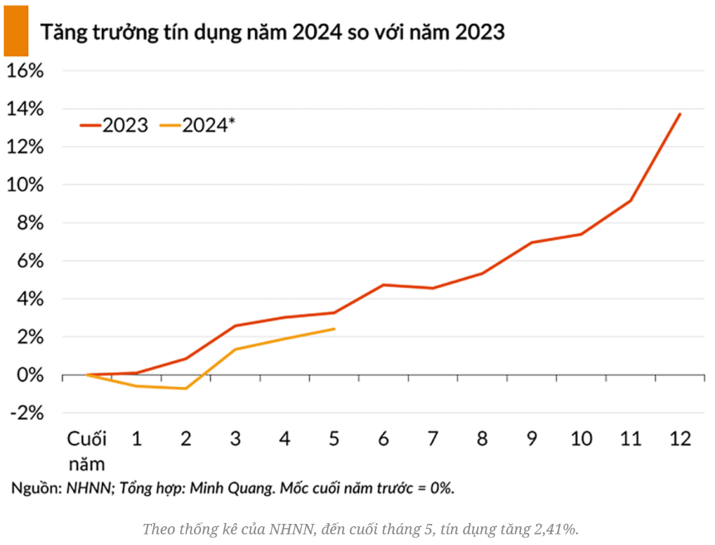 Theo thống kê của NHNN, đến cuối tháng 5, tín dụng tăng 2,41%. NHNN cho biết sẽ rà soát các văn bản theo luật, nghị định mới để cải thiện khả năng tiếp cận vốn vay.
