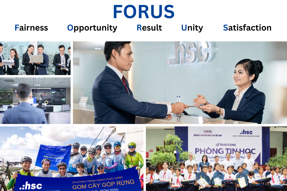 HSC xây dựng văn hóa doanh nghiệp dựa trên các giá trị Công bằng, Cơ hội, Kết quả, Đoàn kết và Sự hài lòng – FORUS (Fairness – Opportunity – Result – Unity – Satisfaction). Việc triển khai thành công văn hóa FORUS đã giúp gia tăng đáng kể tất cả các chỉ số gắn kết nhân viên và đây là một trong những yếu tố quan trọng để HSC thu hút và giữ chân nhân tài.