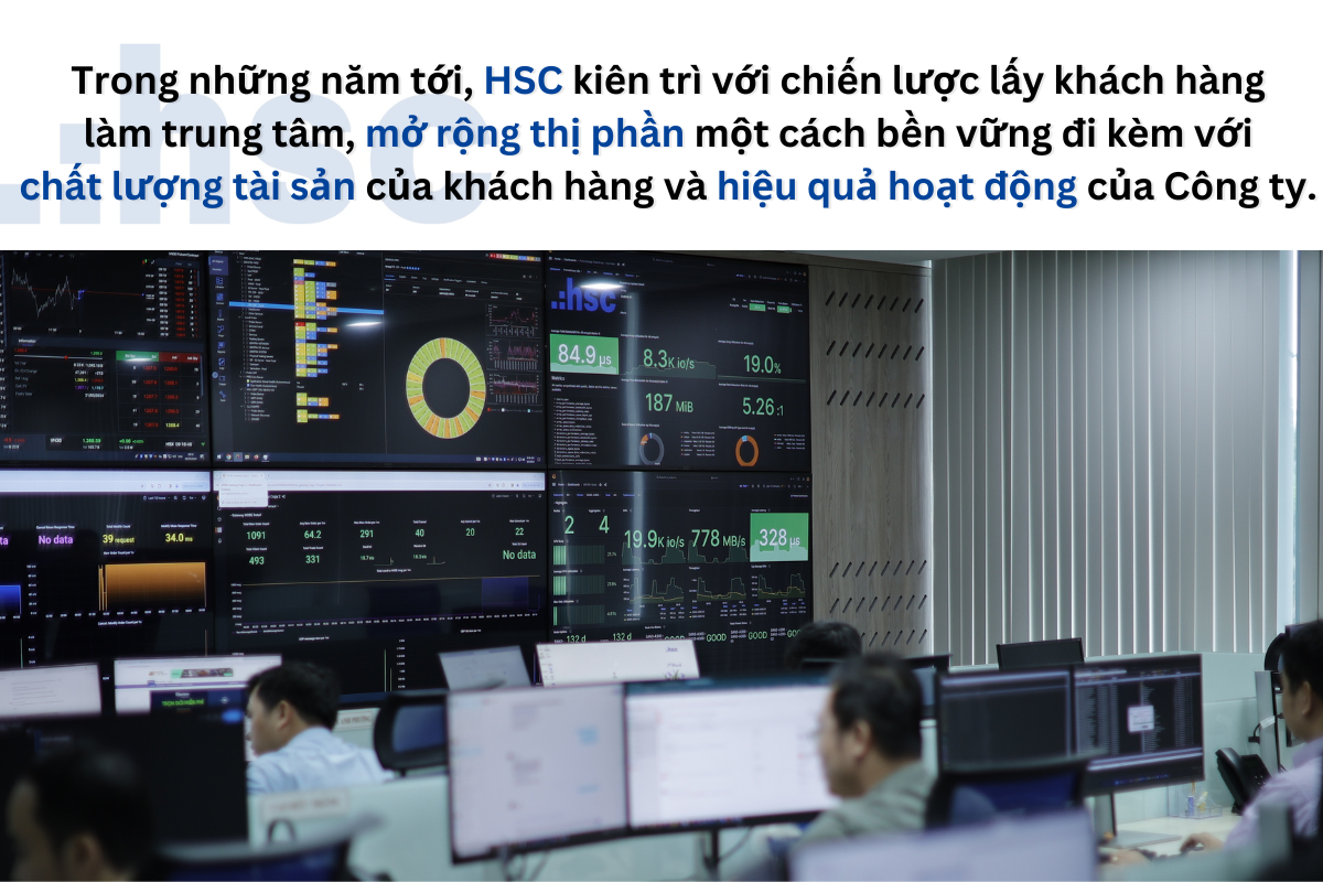 Khi được hỏi về bức tranh rộng hơn, trong 10 năm tới, định vị HSC trong bản đồ thị trường chứng khoán sẽ thế nào, đại diện HSC chia sẻ, Công ty vẫn kiên định với mục tiêu trở thành một trong những định chế tài chính dẫn đầu ngành Chứng khoán và Thị trường vốn tại Việt Nam trong những chuẩn mực về: Tính chuyên nghiệp, sáng tạo, sức khỏe tài chính và phát triển bền vững.