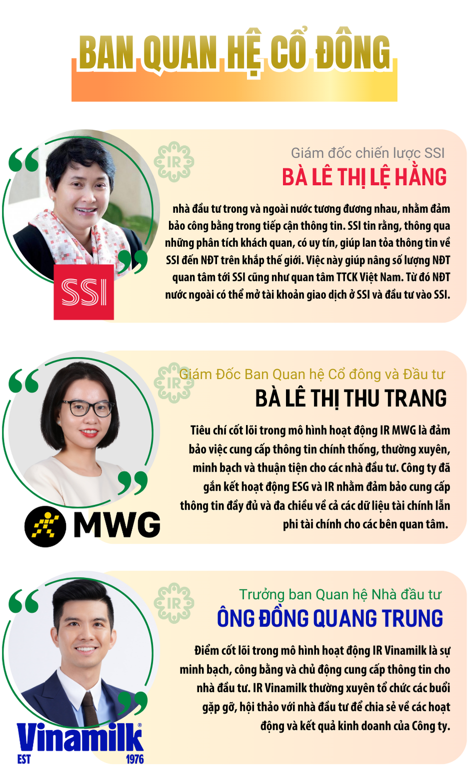 Các nguyên tắc IR (Investor Relations) được doanh nghiệp triển khai đều hướng đến sự minh bạch, công bằng, chính xác, kịp thời trong tiếp cận thông tin, tuân thủ các quy định công bố thông tin và không ngừng tiếp cận các chuẩn mực quốc tế.