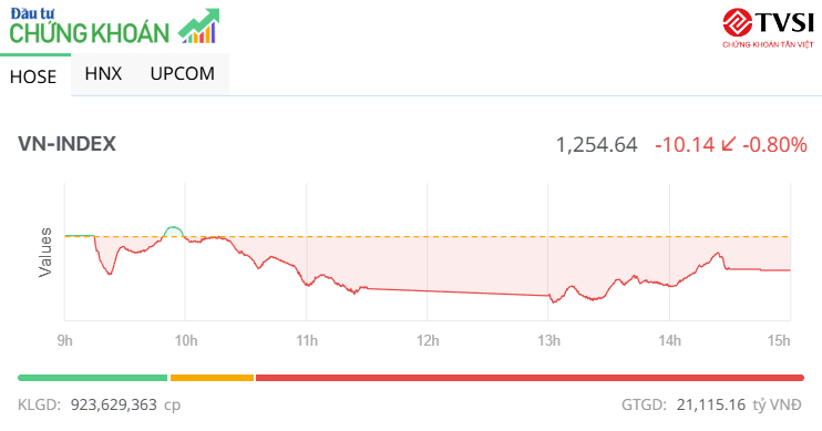 Đóng cửa, sàn HOSE có 96 mã tăng và 350 mã giảm, VN-Index giảm 10,14 điểm (-0,80%), xuống 1.254,64 điểm. Tổng khối lượng giao dịch đạt hơn 923,6 triệu đơn vị, giá trị 21.115,1 tỷ đồng, tăng hơn 16% về khối lượng và 14% về giá trị so với phiên cuối tuần trước. Giao dịch thỏa thuận đóng góp hơn 89,2 triệu đơn vị, giá trị 2.008 tỷ đồng.