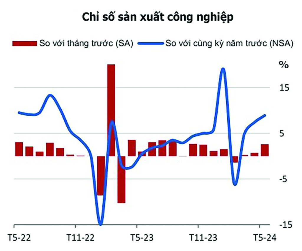 Chỉ số sản xuất công nghiệp (IIP) tháng 5/2024 tăng 2,6% so với tháng trước. Nguồn: Báo cáo Tình hình Kinh tế vĩ mô Việt Nam tháng 5/2024 của WB