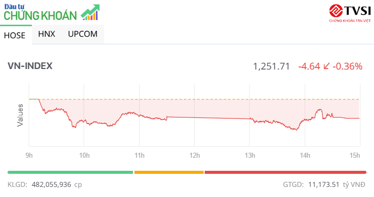 Đóng cửa, sàn HOSE có 163 mã tăng và 210 mã giảm, VN-Index giảm 4,64 điểm (-0,37%), xuống 1.251,71 điểm. Tổng khối lượng giao dịch đạt hơn 482 triệu đơn vị, giá trị 11.173,5 tỷ đồng, tăng hơn 11% về khối lượng và gần 7% về giá trị so với phiên hôm qua. Giao dịch thỏa thuận đóng góp hơn 98,4 triệu đơn vị, giá trị 2.013 tỷ đồng.
