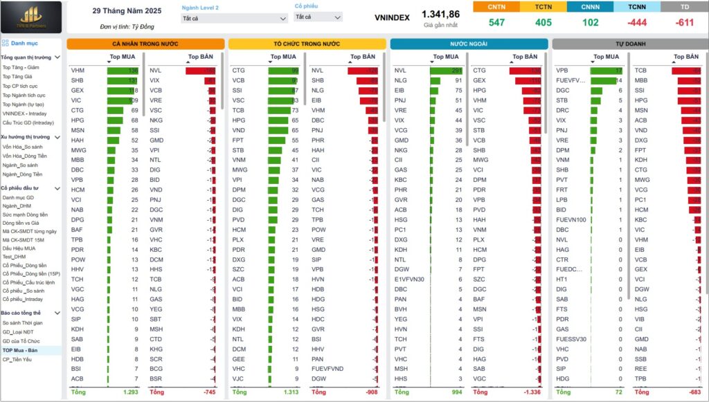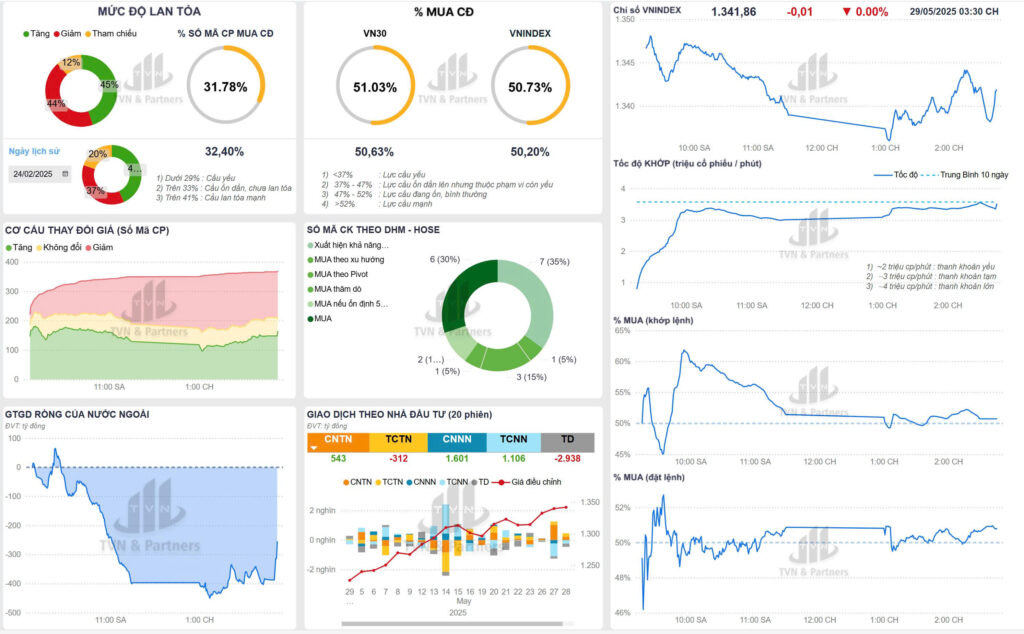 Phiên 29/05/2025, thị trường đi ngang, dòng tiền phân hóa, khối ngoại bán ròng mạnh, áp lực chốt lời tăng. Nhóm bất động sản, dịch vụ tài chính, hóa chất vẫn thu hút dòng tiền chủ động, là lựa chọn ưu tiên cho phiên 30/05/2025. Thị trường phái sinh giằng co, basis âm, tâm lý phòng thủ, nhưng Long vẫn chiếm ưu thế nhờ sự đồng thuận của cổ phiếu trụ. Nhà đầu tư nên duy trì tỷ trọng hợp lý, tập trung cổ phiếu có tín hiệu mua mạnh, đồng thời chú ý rủi ro từ khối ngoại, tự doanh và biến động vĩ mô quốc tế[8][9][10][11].