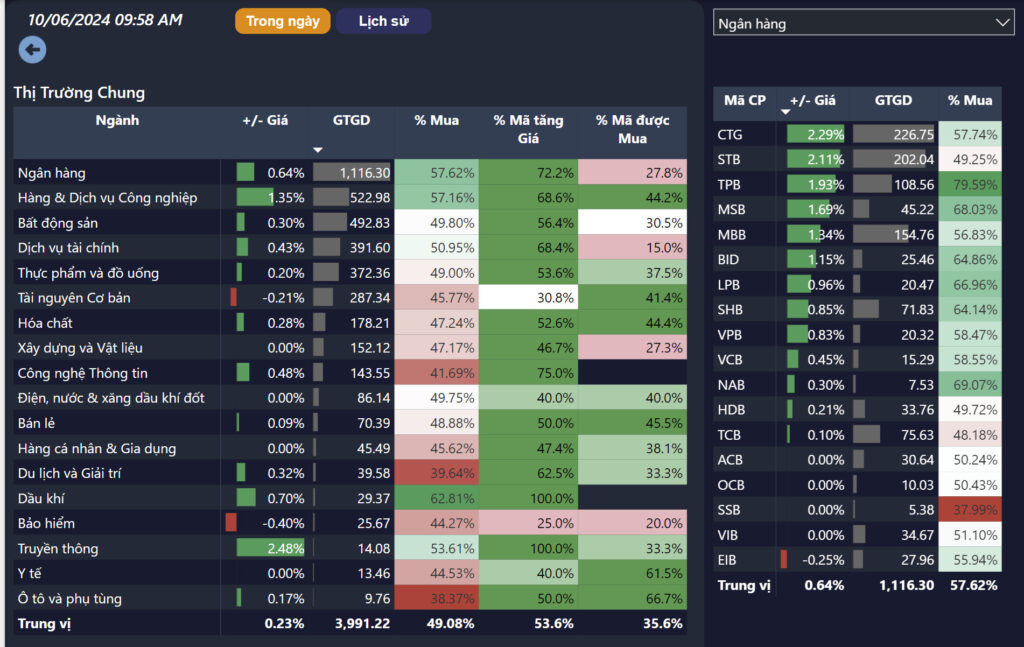 Nhóm Ngân hàng thanh khoản tích cực nhất so với các phần còn lại, nhiều mã xanh nhưng số lượng mã cổ phiếu Ngân hàng đang có cầu thì lại không tương đồng.