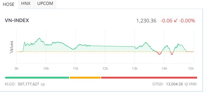 Chốt phiên, VN-Index đứng ở mức 1.230,36 điểm, gần như không thay đổi, dù số mã giảm chiếm ưu thế so với số mã tăng (243 mã giảm so với 163 mã tăng). Tổng khối lượng giao dịch đạt 507,2 triệu đơn vị, giá trị 13.004,6 tỷ đồng, giảm 6% về khối lượng và tương đương về giá trị so với phiên hôm qua. Trong đó, giao dịch thỏa thuận đóng góp 64 triệu đơn vị, giá trị 2.177 tỷ đồng.