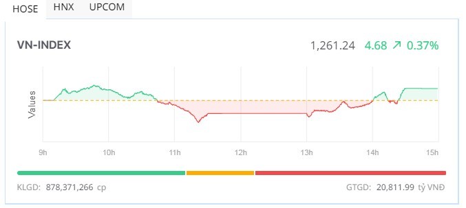 Đóng cửa, VN-Index tăng 4,68 điểm (+0,37%), lên 1.261,24 điểm với 190 mã tăng (nhiều hơn phiên sáng 81 mã), trong khi số mã giảm bớt đi tương ứng, còn 216 mã, trong đó có 8 mã tăng kịch trần, trong khi chỉ còn duy nhất KHP giảm kịch sàn. Tổng khối lượng giao dịch đạt 878,4 triệu đơn vị, giá trị 20.812 tỷ đồng. Trong đó, giao dịch thỏa thuận đóng góp 289,3 triệu đơn vị, giá trị 5.420 tỷ đồng.