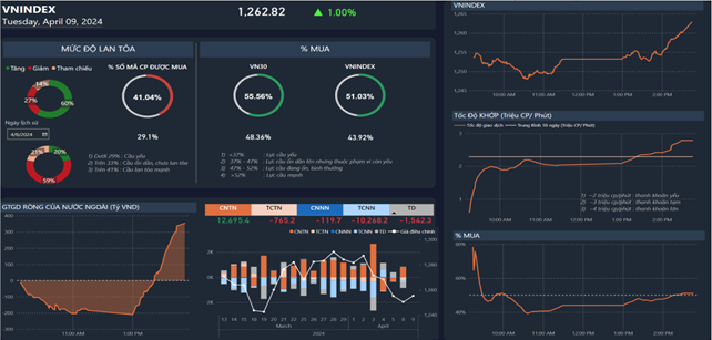 Phiên giao dịch ngày 09/04/2024 chỉ là nhịp hồi T+ dù số lượng mã chứng khoán được mua có lên mốc lan tỏa, nhưng tốc độ giao dich rất thấp, thấp hơn ở những phiên nện ẩn 3.5 triệu cổ phiếu và cao hơn là 4.5 triệu cổ phiếu/phút.