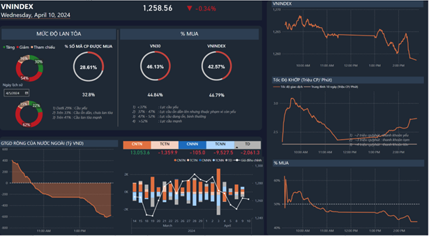 Phiên 10/4 là phiên KHÔNG ĐẸP dù VN-Index hay cổ phiếu đều giao dịch trong biên của một nhịp hồi kỹ thuật, điểm xấu của cách giao dịch này là nó mang dang dấp của việc sideway các vùng cao (tức hạ dần các vùng kháng cự xuống mức thấp hơn). Và nếu cách giao dịch này tiếp diễn thì vùng 1255 – 1258 sẽ trở thành kháng cự của thị trường trong đợt này.