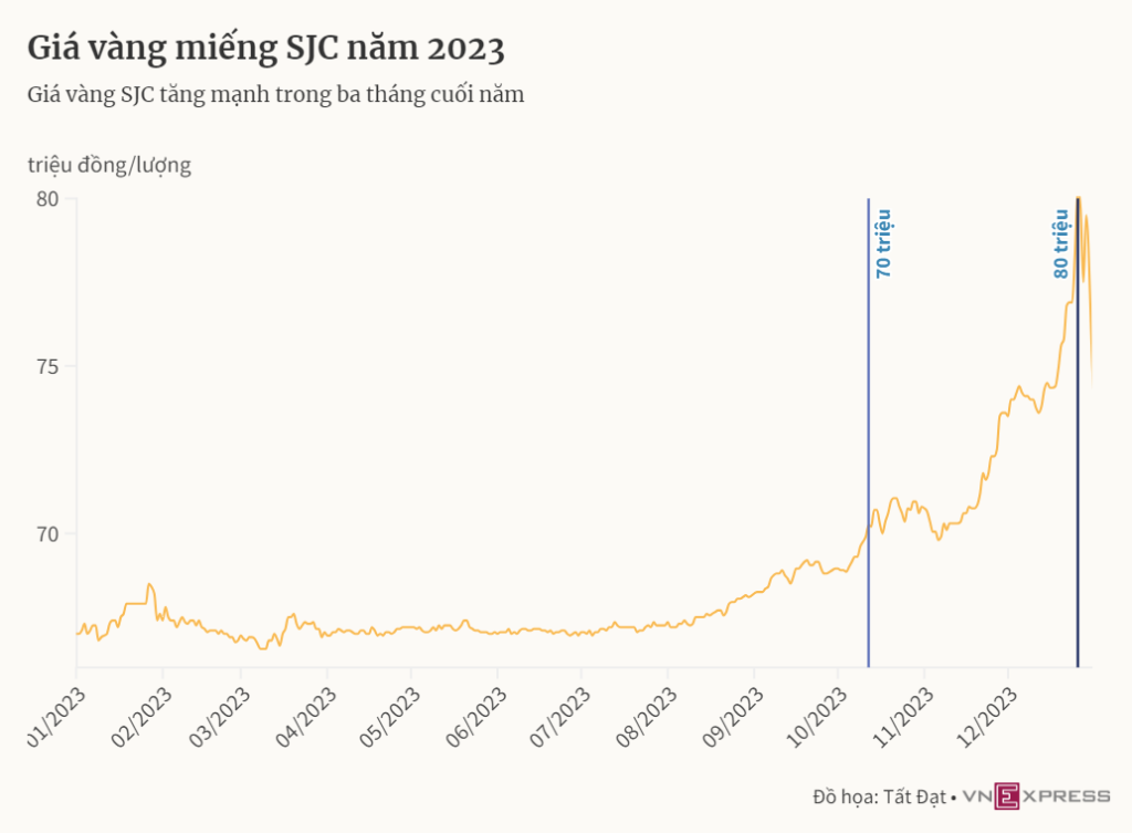 Năm ngoái, giá vàng SJC tăng trung bình 19%. Đặc biệt, thị trường kim loại quý có đợt biến động mạnh trong giai đoạn cuối năm. Sau khi vượt 70 triệu đồng vào giữa tháng 10/2023, giá vàng rung lắc liên tục. Riêng hai tuần cuối năm, thị trường biến động, như ngày 26/12, vàng miếng SJC tăng từng giờ và vượt 80 triệu đồng.