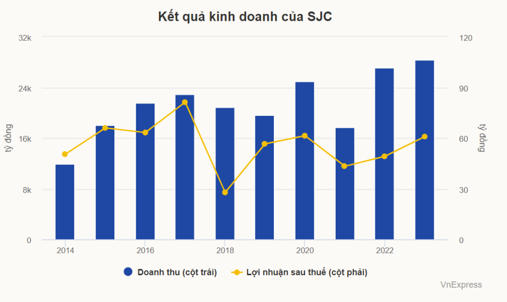 Năm ngoái, SJC lập đỉnh doanh thu với hơn 28.400 tỷ đồng, nhưng lợi nhuận sau thuế vỏn vẹn 61 tỷ, tức bán được 1 tỷ họ chỉ lãi 2 triệu đồng.