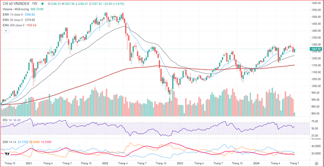 Về mặt kỹ thuật, chỉ số VN-Index lùi lại khi vượt nhẹ mốc 1.300 điểm trong tháng 6. Các chỉ báo kỹ thuật RSI duy trì trung tính, ADX trung hạn quay lại vị thế yếu. Điều này thể hiện xu hướng chỉ số VN-Index trong chu kỳ tháng 07/2024 sẽ có những biến động chưa thực sự lạc quan như kỳ vọng.