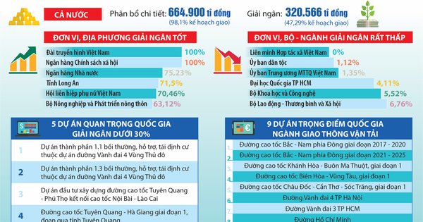 Bộ Nông nghiệp và Phát triển nông thôn, Bộ Giao thông Vận tải nằm trong nhóm bộ – ngành dẫn đầu về giải ngân vốn đầu tư công, trong khi điểm sáng ở nhóm địa phương là tỉnh Long An