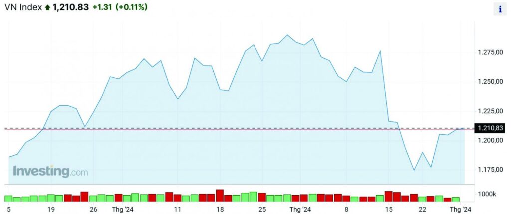 Tuy nhiên, cấu trúc của thị trường không phải chỉ là VN-Index, không chỉ là điểm số, mà có thời điểm kéo VN-Index lên và cũng có thời điểm bán xuống. Nhà đầu tư cũng sẽ bị “quăng quật”, do đó, nếu chỉ phân tích VN-Index thì có thể bị nhiễu, chẳng hạn như thị trường có thể về tới 1.205 – 1.208, nhưng các cổ phiếu vẫn còn đang giảm sâu. Đây là một điểm nhà đầu tư phải hết sức lưu ý.
