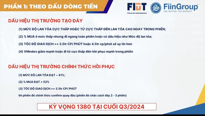 Dấu hiệu thị trường tạo đáy sẽ xuất hiện ở một phiên điều chỉnh, lực bán mạnh như tỷ lệ hấp thụ cao – thanh khoản cao. Các dữ liệu có thể đo lường như: Mức độ lan tỏa đạt khoảng 41%; lực mua đạt hơn 52%; tốc độ giao dịch theo dữ liệu ở khoảng hơn 3,5 triệu cổ phiếu/phút; cùng với đó dấu hiệu xác nhận thị trường hồi phục. Khi đó, lực bán giảm, cầu nhẹ nhưng VN-Index sẽ tăng lên rất nhanh. Và lúc đó thị trường có dấu hiệu chính thức hồi phục.