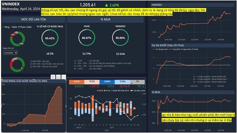 Theo dữ liệu ghi nhận, đường trung bình lệnh bán và trung bình lệnh mua từ 29 tháng 3 cho tới ngày 4 và 5 tháng 4/2024 cho thấy lực bán bắt đầu trội lên rất mạnh. Đây là những dấu hiệu bắt buộc chúng ta cần phải hết sức lưu ý. Lúc này, VN-Index và điểm số chưa tác động nhiều nhưng với các tín hiệu cảnh báo này, chúng tôi cùng các nhà đầu tư đã bật “chế độ” cảnh báo cao.