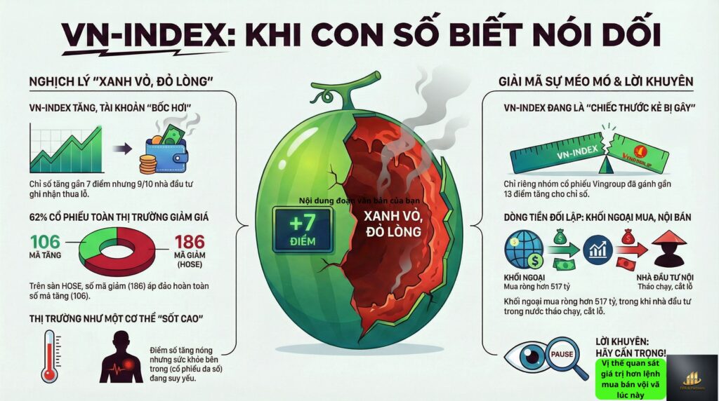 Các chuyên gia phân tích đã chỉ ra rằng, VN-Index hiện tại giống như một “chiếc thước kẻ bị gãy” đã mất đi chức năng đại diện cho sức khỏe chung của nền kinh tế. Số liệu từ phiên giao dịch chứng minh điều này: