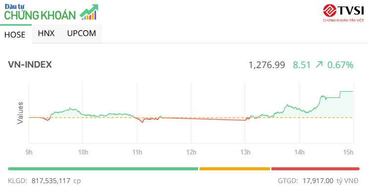 Đóng cửa, sàn HOSE có 256 mã tăng và 119 mã giảm, VN-Index tăng 8,51 điểm (+0,67%), lên 1.276,99 điểm. Tổng khối lượng giao dịch đạt hơn 817,5 triệu đơn vị, giá trị 17.917 tỷ đồng, tăng 45% về khối lượng và 39% về giá trị so với phiên hôm qua. Giao dịch thỏa thuận đóng góp hơn 327,7 triệu đơn vị, giá trị 6.332 tỷ đồng.